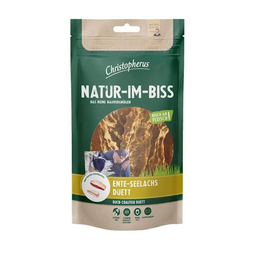 Christopherus Natur-Im-Biss Ente-Seelachs Duett ist ein getreidefreier, fettreduzierter Hundesnack aus 72 % Ente und 23 % Seelachs ohne künstliche Zusätze.
