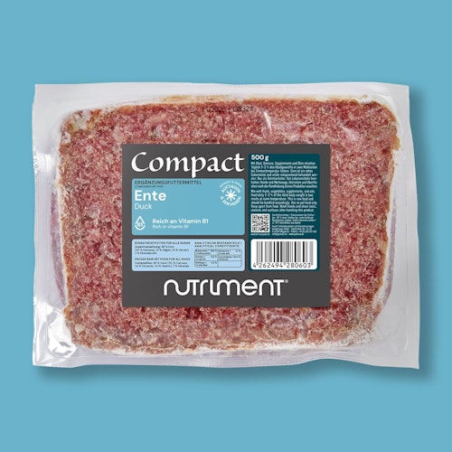 NUTRIMENT Compact Ente ist ein hypoallergenes, getreidefreies Frostfutter mit hohem Energiegehalt, ideal für aktive Hunde, Allergiker und BARF-Ernährung.