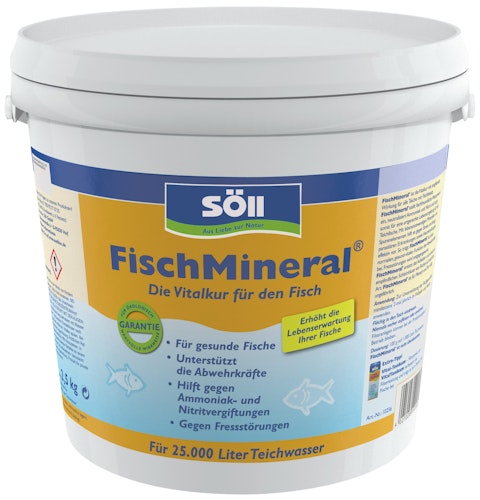 FischMineral ist die Vitalkur mit entgiftender Wirkung für alle Teiche mit Fischbesatz. FischMineral stellt fischfreundliche Wasserwerte ein, neutralisiert Ammoniak und Nitrit und sorgt somit für eine artgerechte Lebensumgebung für alle Teichfische. Mit lebensnotwendigen Mineralien und Spurenelementen hilft es gegen Stress und beugt parasitären Erkrankungen sowie Hautverpilzungen effektiv vor. So trägt FischMineral zu einer normalen, gesund-vitalen Funktion der Abwehrkräfte bei. FischMineral ersetzt das Aufsalzen und schützt die empfindlichen Schleimhäute von Fischen auf natürliche Art.