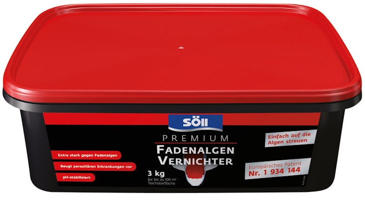 Das massenhafte Wachstum von Fadenalgen wird gerade in Koi-Teichen aufgrund fehlender Pflanzen und des Dauerbetriebs von UV-Anlagen gefördert. Phosphate werden nicht verbraucht. Somit steht den Fadenalgen der Hauptnährstoff für ungehemmtes Wachstum reichlich zur Verfügung. Premium FadenalgenVernichter wurde speziell für Koi-Teiche entwickelt und zerstört durch die sofortige Freisetzung von aktivem Sauerstoff selbst hartnäckigste Fadenalgen innerhalb weniger Stunden. Der Wirkstoff zerfällt währenddessen in Wasser und Sauerstoff. Bereits kurz nach der Anwendung können die abgestorbenen Algenreste abgekeschert werden. Premium FadenalgenVernichter färbt das Wasser nicht.