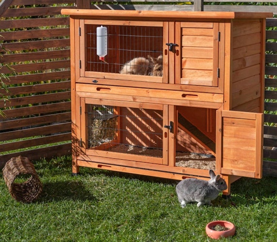 Der TRIXIE Kleintierstall ist ein 2-stöckiger, brauner Stall aus lasiertem Kiefernholz, ideal für Kaninchen und Meerschweinchen, mit vielen praktischen Funktionen.