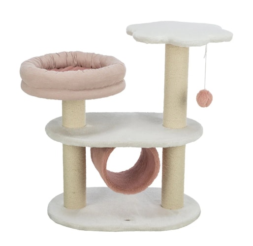Der TRIXIE Kratzbaum für Katzen bietet 3 Ebenen, einen Tunnel, eine Plattform und ein herausnehmbares Kuschelbett in weiß/altrosa.