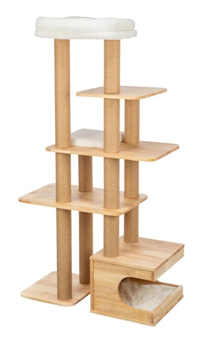 TRIXIE bietet einen 147 cm hohen Kratzbaum aus gewachstem Gummibaumholz für Katzen, mit abnehmbarem Bett und integrierter Höhle.